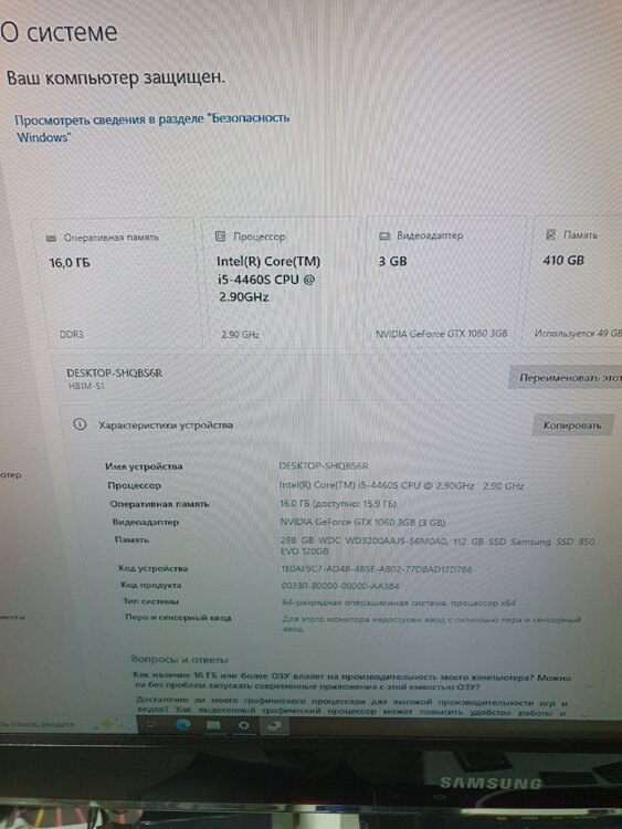Процессор: Intel® Core i5 4460sProcessor 6MB Cache 4 ядра