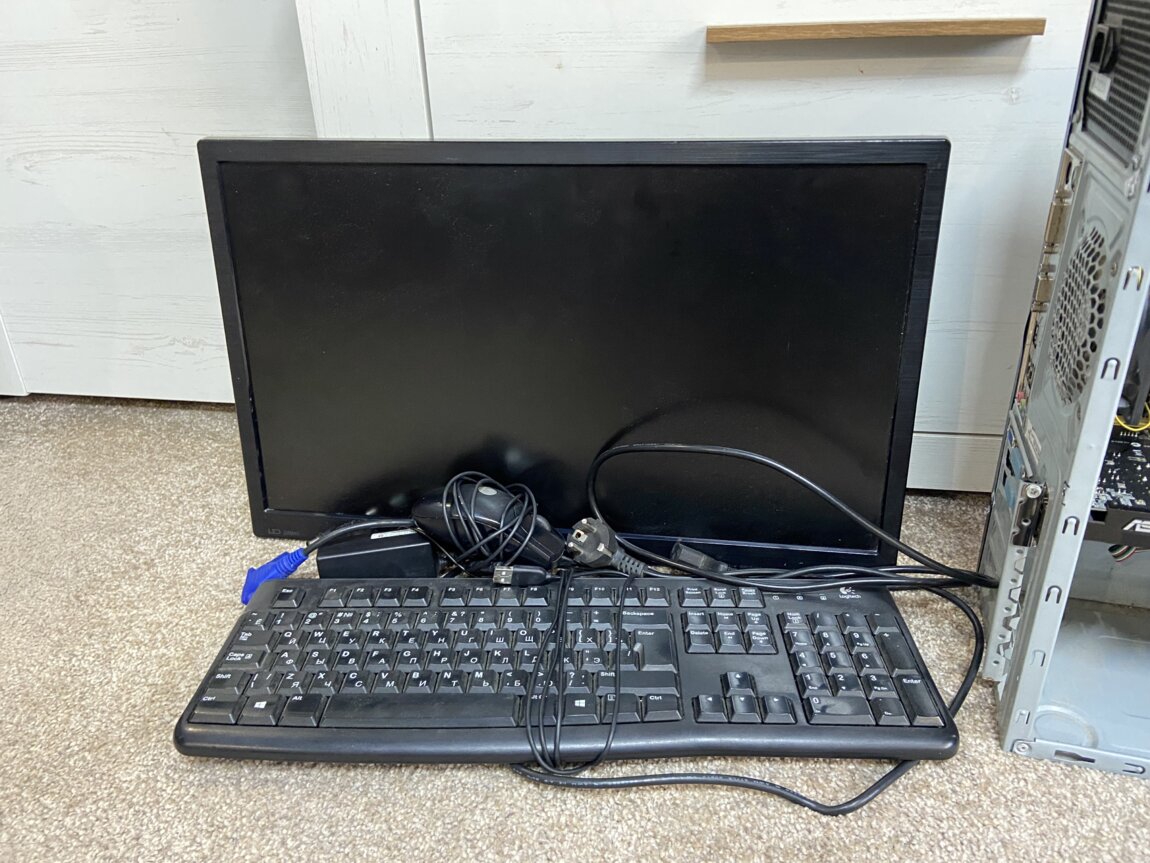 В комплекте: сам пк, монитор (full hd) и мышь, клавиатура, шунры.