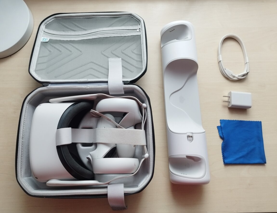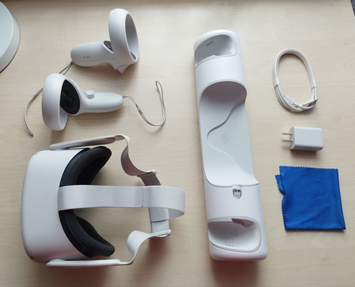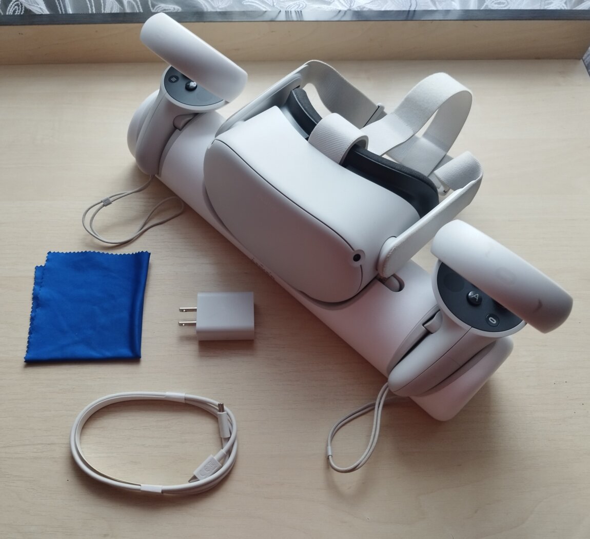 В комплект идет кабель, блок от зарядки, спец. тряпочка для линз, переноска для виар, а так же зарядная станция для виар и контроллеров + насадки пистолеты на джойстик
