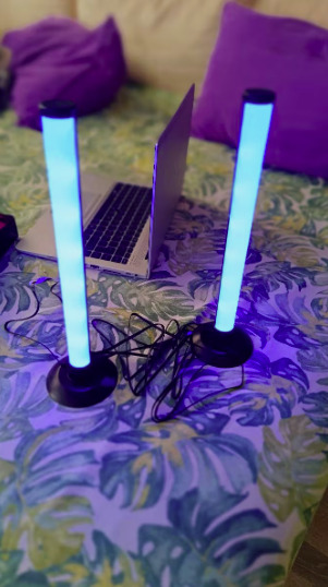 Состоит из 2 шт. длиной по 30см, с подставками выше. Синхронизацией музыки по цвету так и ритму (есть свой встроенный микрофон), есть таймер вкл. и выкл. по времени, можно управлять как с пульта (очень качественный на 2ААА батарейках) так и с телефона, подходят для игровых комнат, спален, подарков на день рождения так как новое в упаковке.