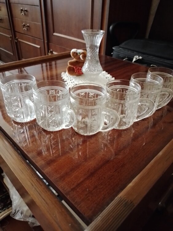 Бокальчики по 15р набор чашки с блюдами 6шт 100р чайник ёмкость 2л 150р