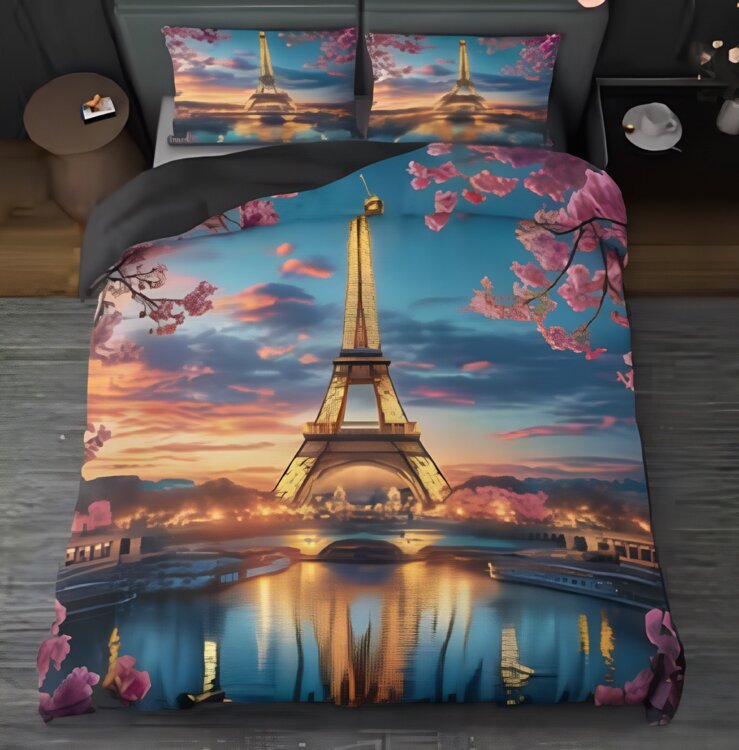 НОВОЕ постельное белье с ярким 3D-принтом Эйфелевой башни в окружении цветущей сакуры на фоне заката на МОЛНИИ со ЗМЕЙКОЙ 1 ПОДОДЕЯЛЬНИК 200х230 см + 2 НАВОЛОЧКИ 50х70 см 3D Цифровая печать высокой четкости. Идеальный подарок для всей семьи и друзей. 100% дышащий полиэстер, всесезонный, машинная стирка.