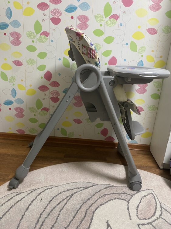 Состояние б/у. Чехол заменён на новый — выглядит аккуратно и свежо. Стульчик можно использовать с рождения и до 3 лет: регулировка высоты, наклон спинки, удобный режим шезлонга.