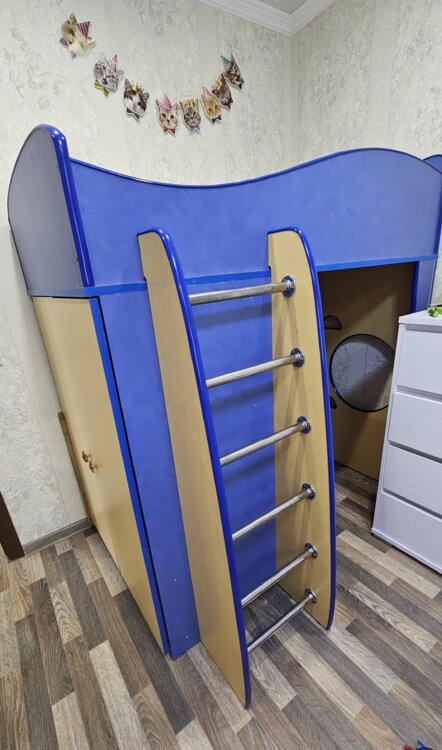 Продаётся кровать- чердак в хорошем состоянии. Сбоку скалолазка. Есть вместительный шкаф для детских вещей, полки для книг, игрушек. Два вместительных ящика, матрас. Очень удобная для деток.. торг