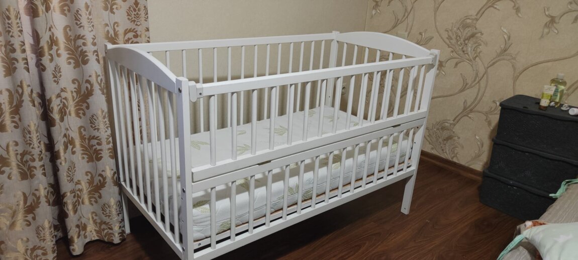 Продадим детскую кроватку. В комплект входит: кроватка с маятником, охранка, матрац, постель! В хорошем состоянии.