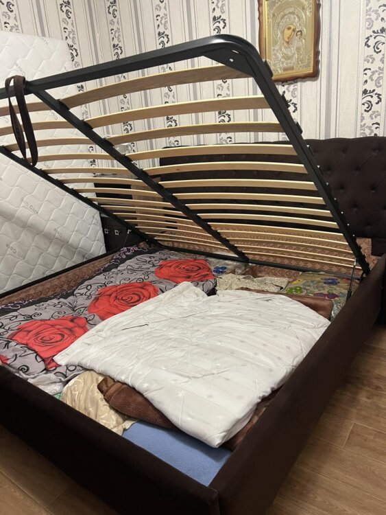 БОЛЬШАЯ очень качественная кровать ФАБРИЧНОГО пр-ва с высоким широким изголовьем, с НОВЫМ ПРУЖИННЫМ МАТРАСОМ(в упаковке!!! ), газовый подъемный механизм, прочное дно ниши-не проваливается, поместится всё!!! спальное место огромное 180/200.Кровать на ножках