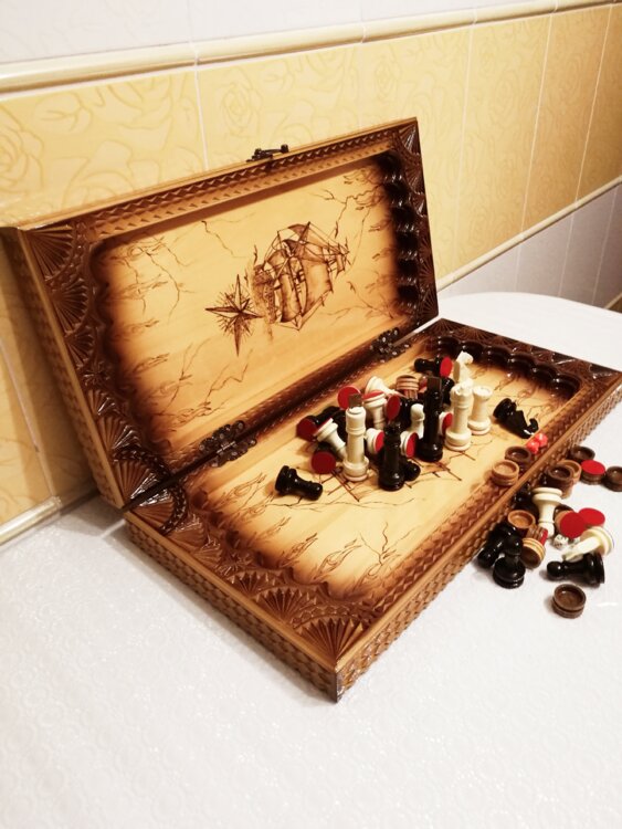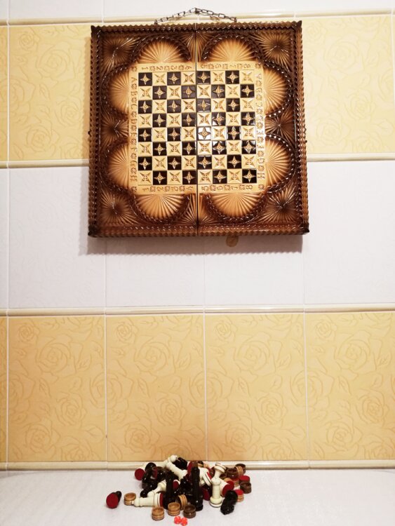Нарды шахматы ореховые борта ручная резьба вырезанные техникой Геометрия со всех сторон и боков также и внутри нард на бортах есть резьба клетки поля вырезаны в форме звёзд нарды облагорожены чеканкой по дереву размер нард 60 на 60см фигурки и фишки ясень дуб кубики кость. Поиграл и повесил на стенку украсит любой интерьер и создаст уютную обстановку а не будут пылиться в углу Широкий выбор в наличии выбирайте. Пишите звоните телеграм ватцап вайбер и мы вам поможем выбрать эксклюзивные нарды ручной резьбы а не дешевую поделку вырезанные на станке выдающую за ручную резьбу!