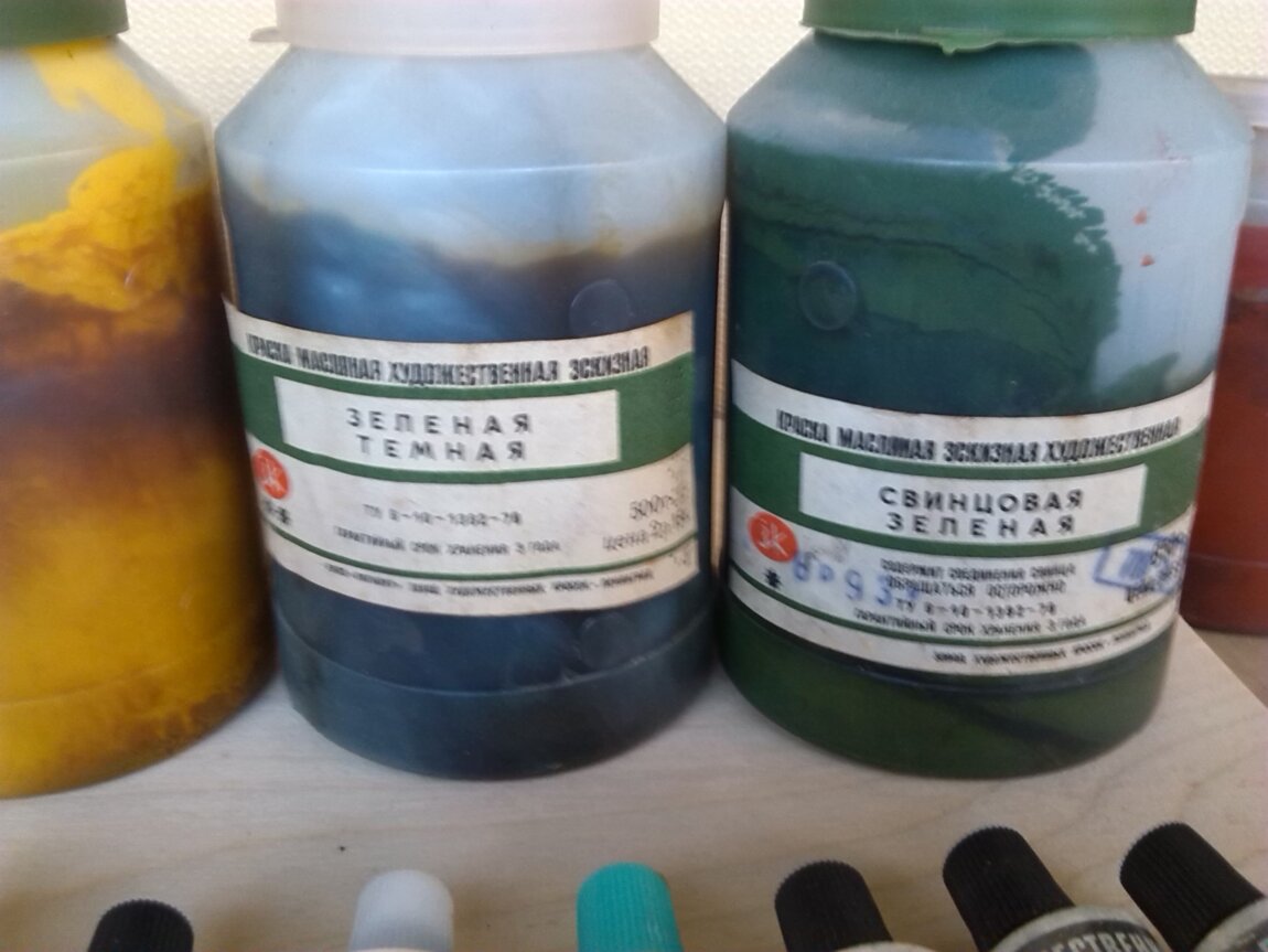 - Краска масляная художественная в банках, Охра Светлая и Золотистая 600гр, Зеленая 600 и 850гр, Киноварь 850гр.