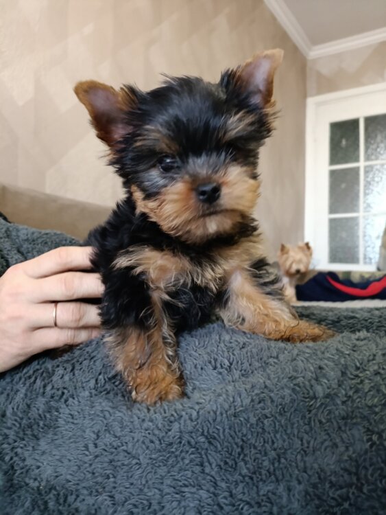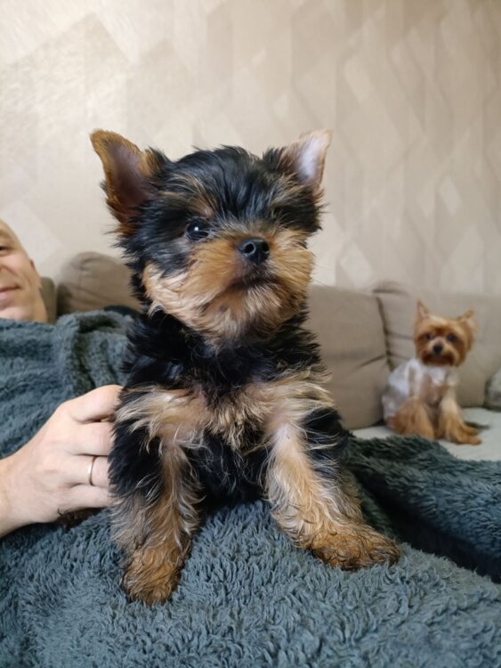 Продам щенка йоркширского терьера, мальчик 2 месяца, прививки поставлены, к латку приучен, ест сам. Мама мелкий стандарт, папа мини. С документами