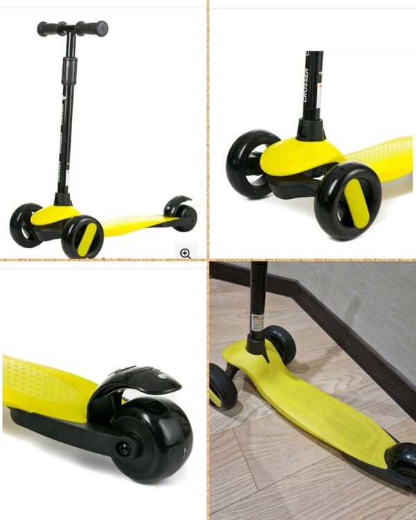 Широкое комфортное сиденье регулируется вверх и назад в трех положениях, регулируемый по высоте в четырех позициях Т-образный руль, светящиеся разными цветами передние полиуретановые колеса.