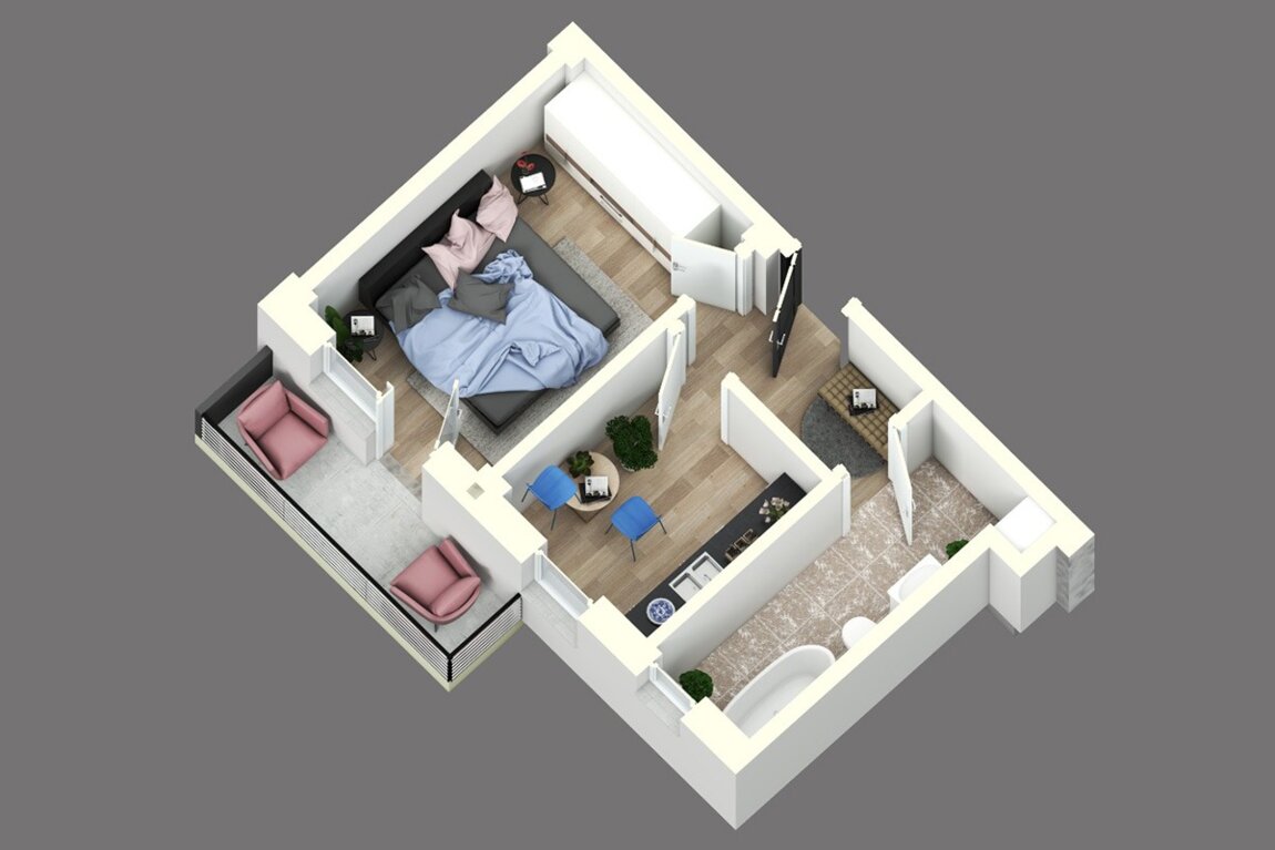 Однокомнатная квартира, 33 кв. м, состоящая из раздельной спальни, кухни, балконом, коридором и санузлом.
