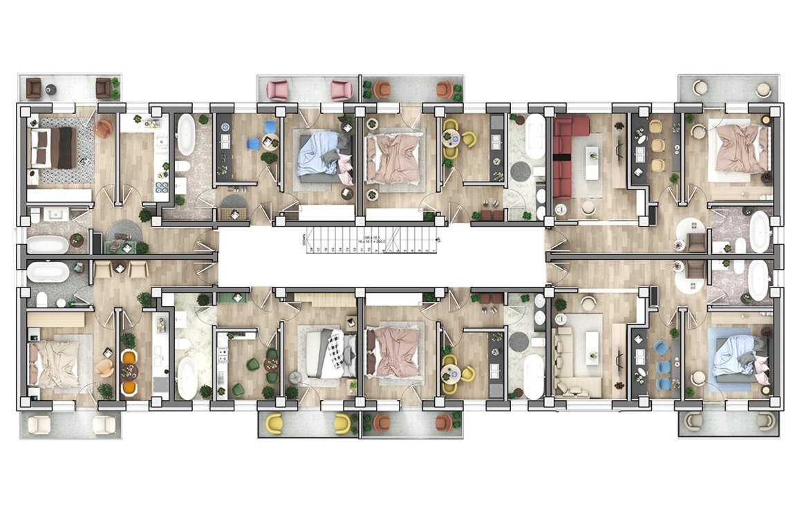 Все квартиры отдельно стоящие, с балконом или с собственным садом на первом этаже. В комплексе есть надземные парковочные места и кладовые. Всего на этаже 8 квартир. Дома на 3-х уровнях, P+1E+2E. Квартиры готовы к сдаче в марте 2026 года.