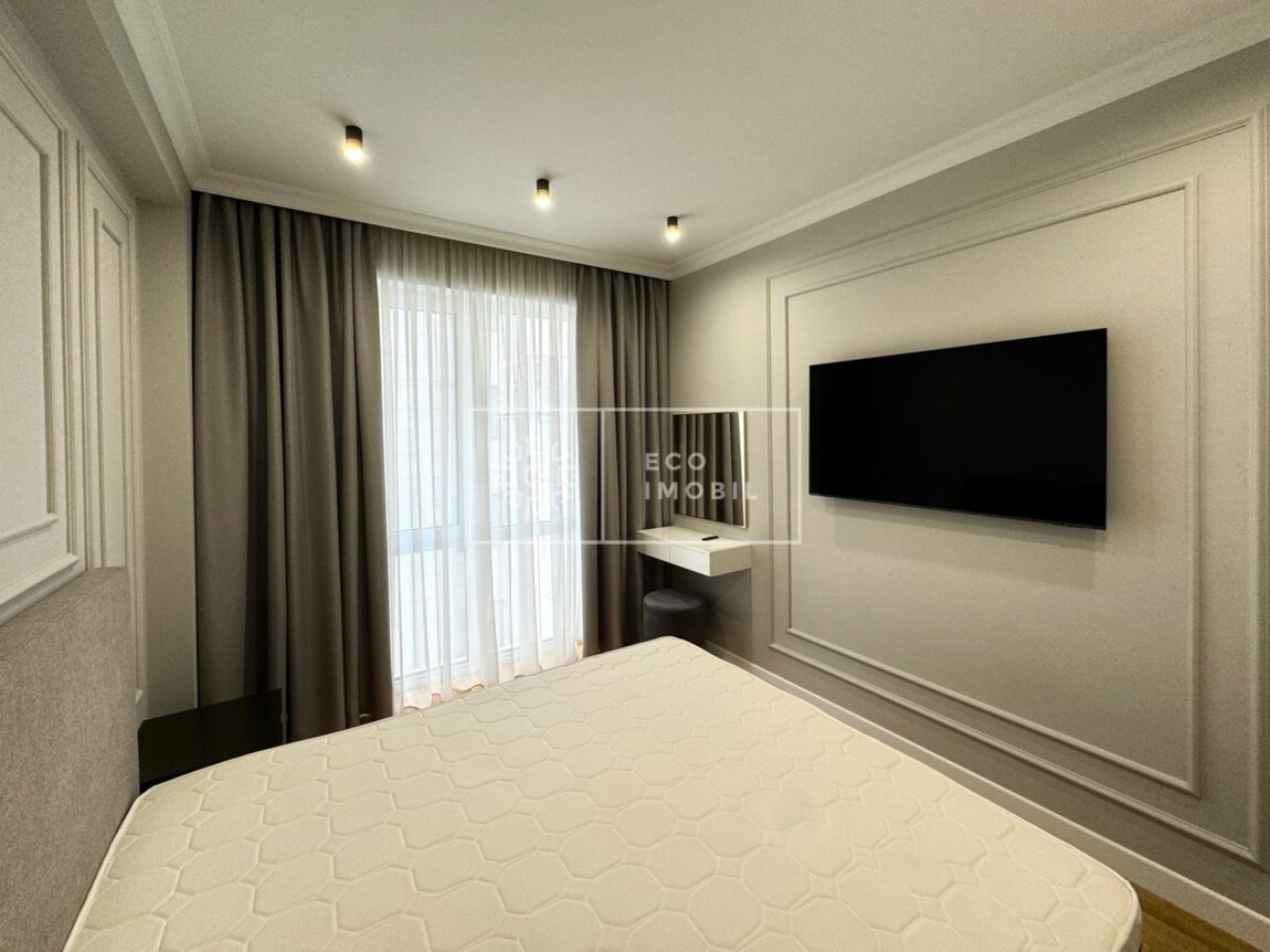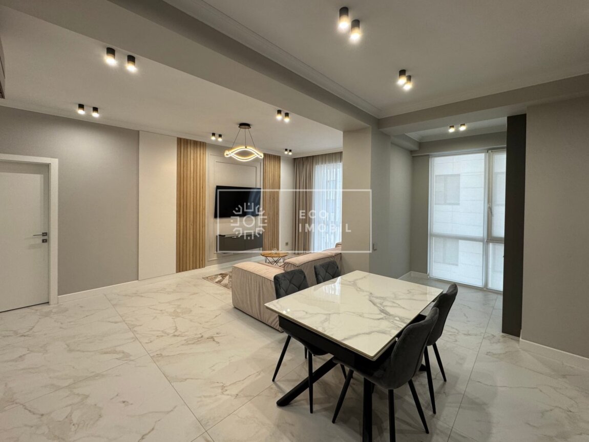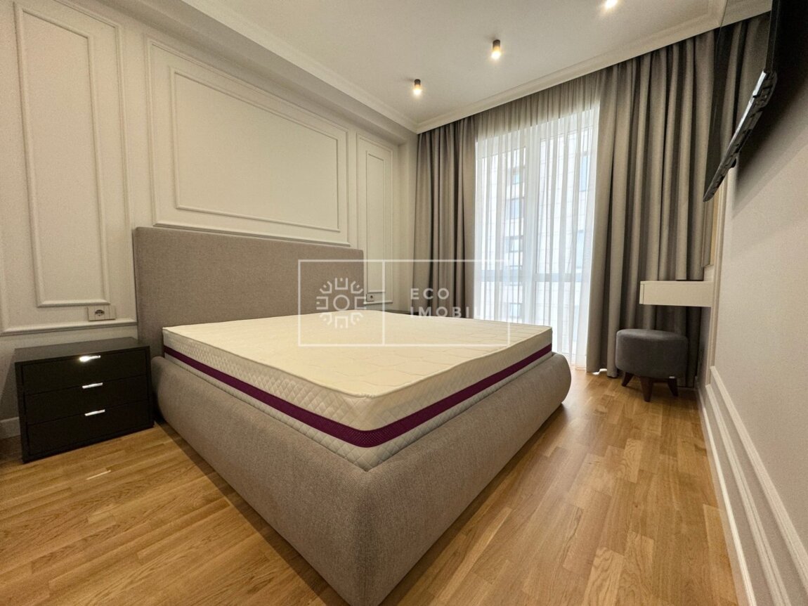 Vă propunem spre chirie apartament cu o odaie și living, bloc nou, amplasat în sect. Centru, str. Tricolorului. Imobilul, cu o suprafață de 65 m.p., este poziționat la etajul 5 din 9. Caracteristici: design individual, dispune de euro reparație, obiecte sanitare instalate, dotat cu mobilă și tehnică de uz casnic, geamuri termopan, alarmă antiincendiară, încălzire autonomă. Compartimentare: un dormitor, living, bucătărie, bloc sanitar. Blocul locativ dispune de zonă de agrement, cameră de luat vederi și paza blocului și ograda de tip închis. În imediată apropiere se găsesc numeroase puncte sociale și comerciale, supermarket, farmacie, grădiniță, restaurante, parc, etc. Acces facil la transport public în orice direcție a orașului. Предлагается в аренду квартира с одной спальней и гостиной в новом доме, расположенном в секторе Центр, ул. Триколорулуй. Недвижимость площадью 65 кв.м находится на 5 этаже из 9. Характеристики: индивидуальный дизайн, евроремонт, установлены санитарные приборы, квартира оснащена мебелью и бытовой техникой, стеклопакеты, противопожарная сигнализация, автономное отопление. Планировка: одна спальня, гостиная, кухня, санузел. Жилой блок располагает зоной отдыха, системой видеонаблюдения и охраной. Двор — закрытого типа. В непосредственной близости находятся разнообразные социальные и коммерческие объекты: супермаркет, аптека, детский сад, рестораны, парк и др. Удобный доступ к общественному транспорту в любом направлении города.