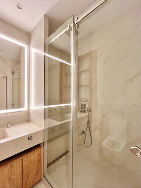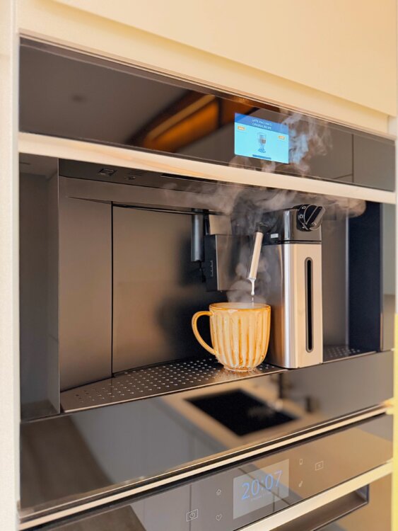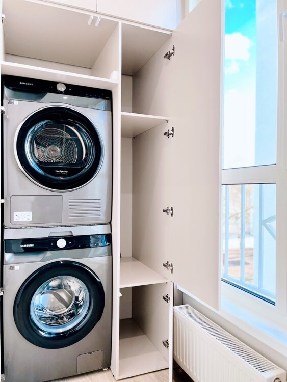 Квартира полностью оснащена всей необходимой техникой: профессиональная кофемашина, духовой шкаф, микроволновая печь, индукционная плита с вытяжкой, посудомоечная и стиральная машины, сушильная машина, встроенный холодильник. В спальне и гостиной — 2 Smart TV (YouTube, Netflix и др. ).