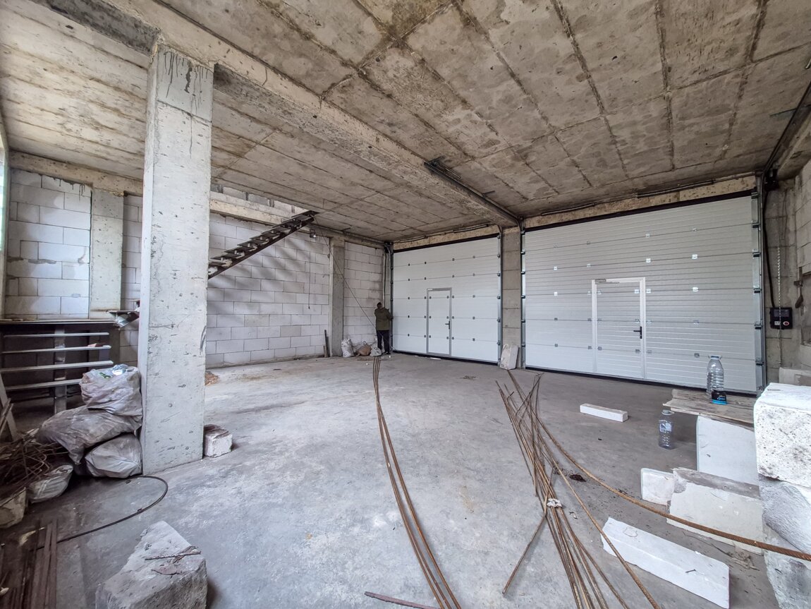 1 этаж (120 м²) — рабочий: два широких въезда, высота ворот около 4 м, потолки ~4,2 м. Усиленный пол позволяет устанавливать подъёмники и работать с тяжёлой техникой, включая бусы и лёгкие грузовики.