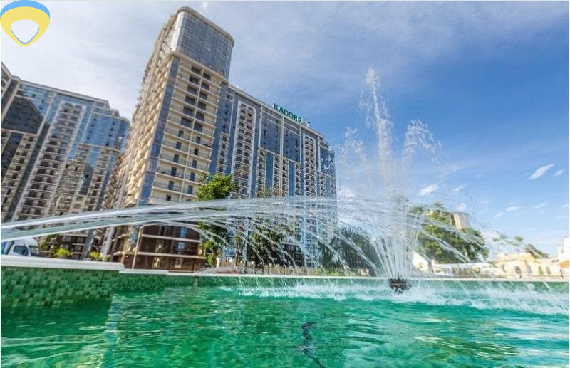 Красивейшая благоустроенная территория с фонтаном.
