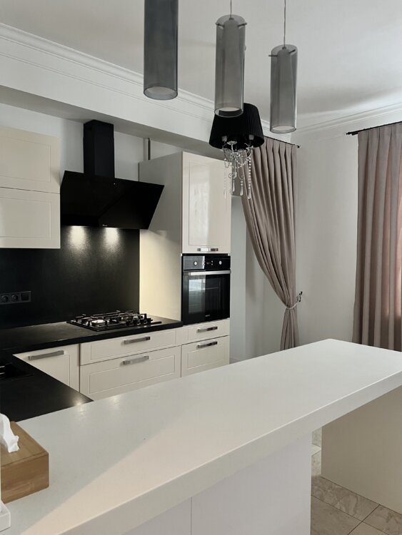 Кухня: каменная столешница+ фартук. Укомплектована всей необходимой техникой.