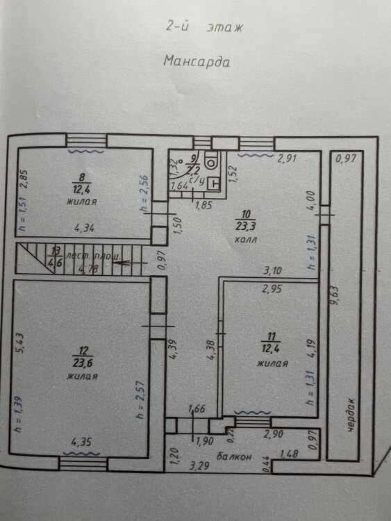 Планировка 2-го этажа (мансарда): 3 спальни, холл (возможно зонирование под доп. комнату), санузел, балкон и кладовая.