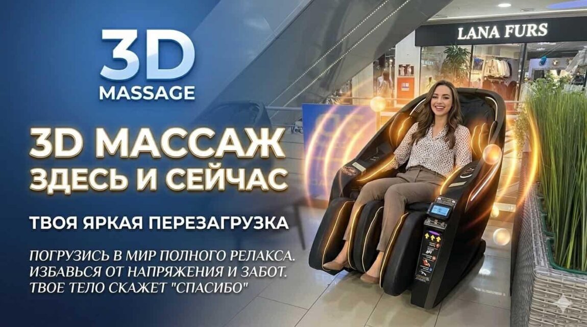 Приглашаем вас расслабиться и восстановить силы в наших массажных креслах, расположенных в торговом центре Atrium.