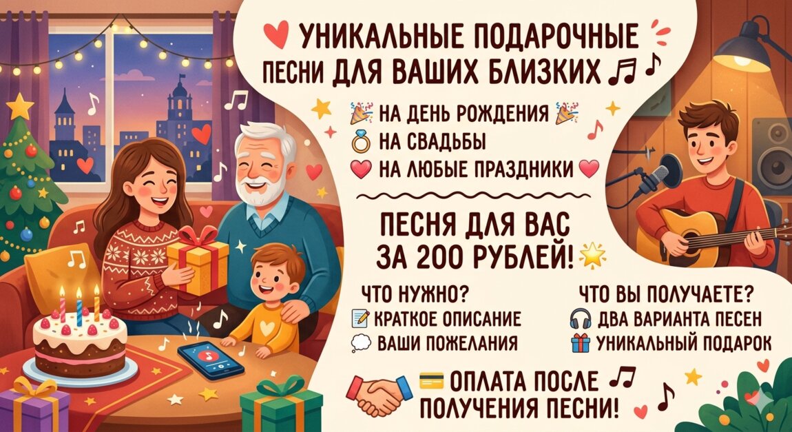 Хотите удивить близких чем-то по-настоящему особенным? Забудьте о банальных сувенирах! Я напишу для вас уникальную песню, созданную специально для виновника торжества.