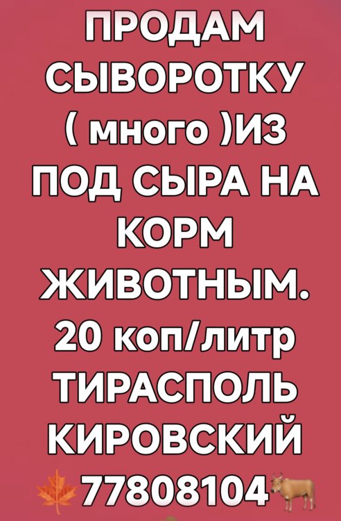 Сыворотка на корм животным 20 коп литр. Можно 400-500 л за раз, самовывоз из Тирасполя р он Кировский.