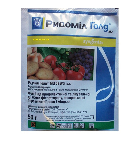 Ридомил Голд применяют для обработки капусты, картофеля, томатов, лука, огурцов, виноград и др., Обеспечивает лечебную и профилактическую защиту от инфекций, грибков и бактерий. -35руб/уп.