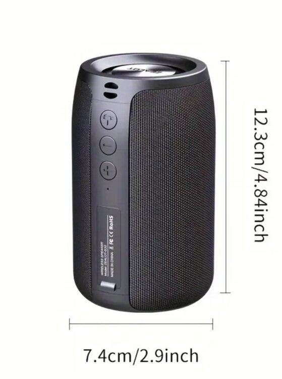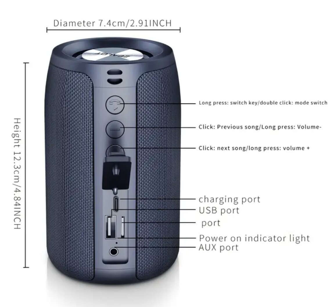 Воспроизводит звук по блютуз, с USB-флешки, с микро-SD карты, AUX. Встроенный микрофон, FM-радио. Аккумулятор 1800мАч, поверхность софт-тач, на дне противоскользящее кольцо. Зарядка type-C, плотная резиновая заглушка, закрывающая порты. В комплекте зарядный кабель и темляк на руку. Отличный звук, достойные басы.
