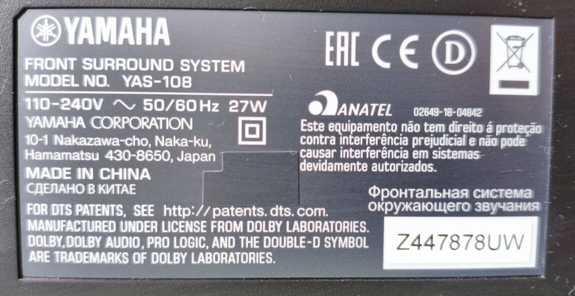 Основные характеристики Yamaha YAS-108: