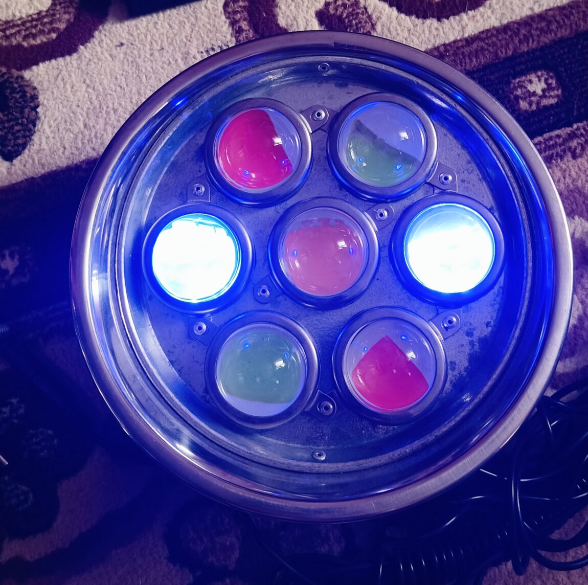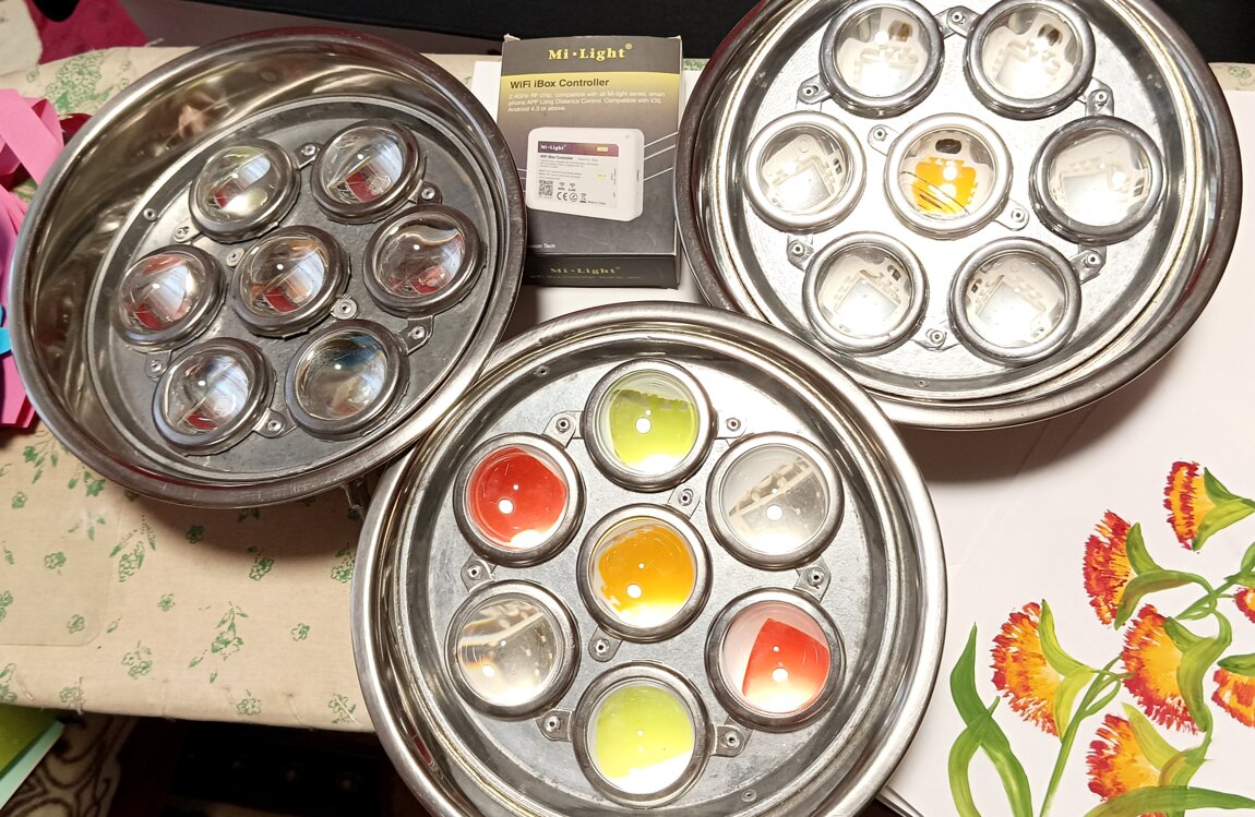 В прожекторы установлены 30W светодиоды и линзы для рассеивания света диаметром 50 мм.