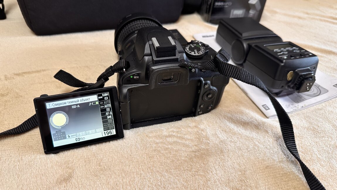 В комплект входит тушка с китовым объективом Nikon DX 18-55