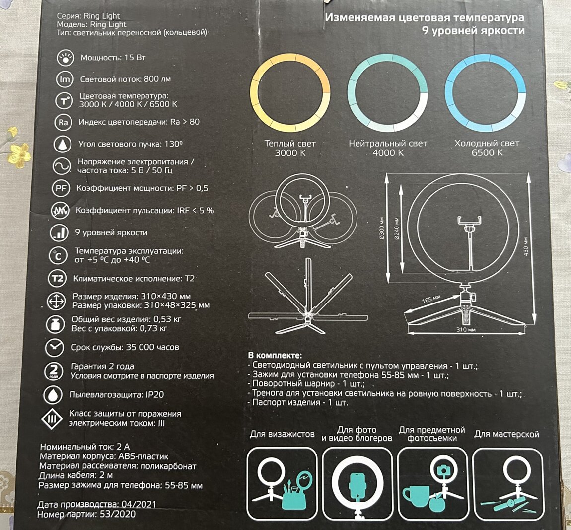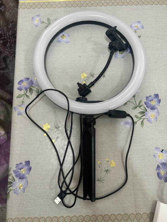 Кольцевой светодиодный светильник с комплектом креплений для установки телефона.