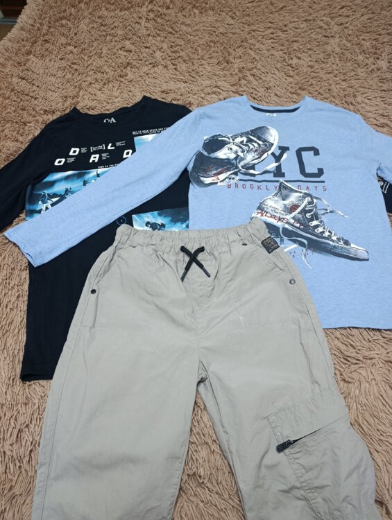 Продам: ветровка синяя на 12 лет-180 рублей, ветровка серая с оранжевым 10 лет-180 рублей, штаны бежевые 10-11 лет-120 руб, футболка поло голубая 10-11 лет-75 руб, голубой и черный реглан 10-12 лет-150 руб за оба.