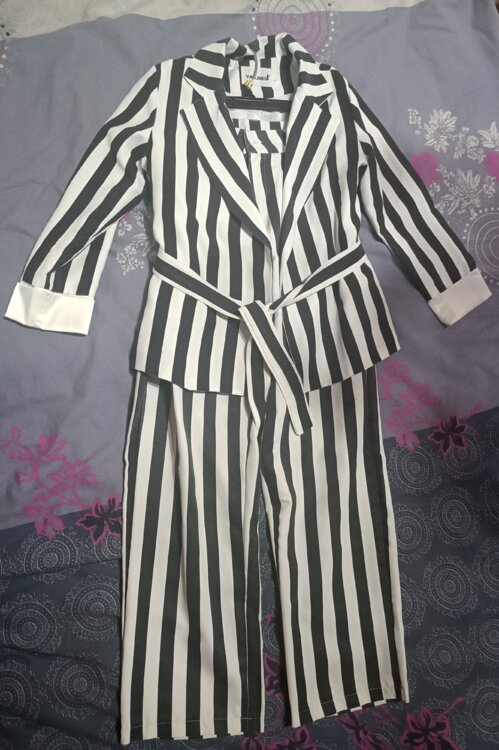 Костюм в полоску тонкий, но очень приятный и качественный материал, стоит надевать в тёплую погоду. Тоже надевала пару раз, состояние нового - костюм 200 руб