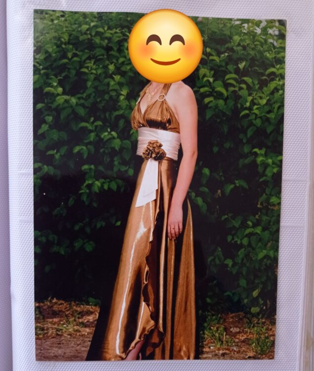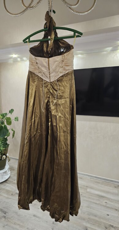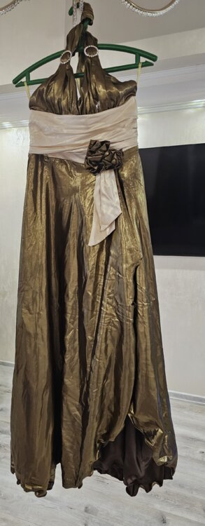 Очень красивое платье, размера 42-44, сзади регулируется по фигуре. С левой стороны высокий разрез. Хорошо садится на любую грудь - регулируется вокруг шеи.