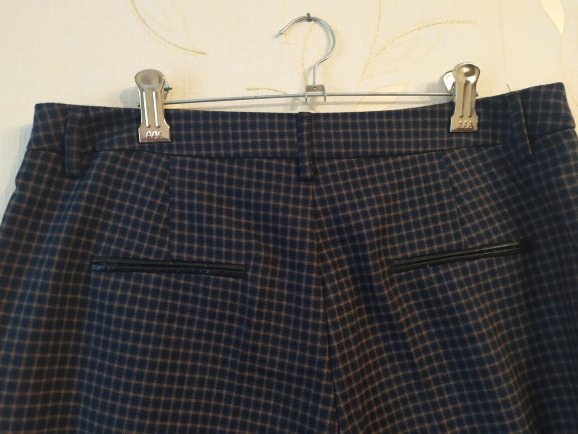 Женские стильные, элегантные прямые брюки. Красивый коричневый (шоколадный) цвет в мелкую клеточку с боковыми карманами. Задние прорезные карманы обработаны кожей. Мягкая вискоза с эластичными волокнами. Очень приятная и комфортная ткань. Брюки в идеальном состоянии.