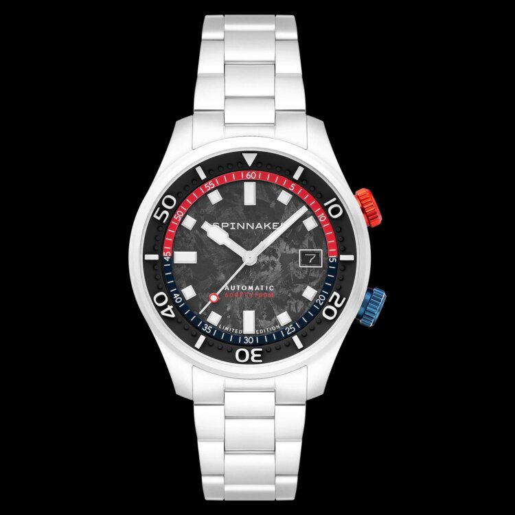 Inspired by the marine environment and water sports, this Bascom watch from Spinnaker's Bradner collection is a limited edition of 600 pieces. Its round case in satin-brushed and silver-tone stainless steel measures 42 mm in diameter and 15 mm thick. Topped by a flat sapphire crystal with anti-reflective treatment, it has two orange and blue winding buttons at 2 and 4 o'clock and a screw-down caseback with a transparent opening. Its black dial is made of carbon fiber and features time indicators coated with a luminescent treatment. A bezel marked by a minute track displaying batons, Arabic numerals, dots and a triangle serving as a countdown surrounds another minute track displaying white graduations and geometric indexes.