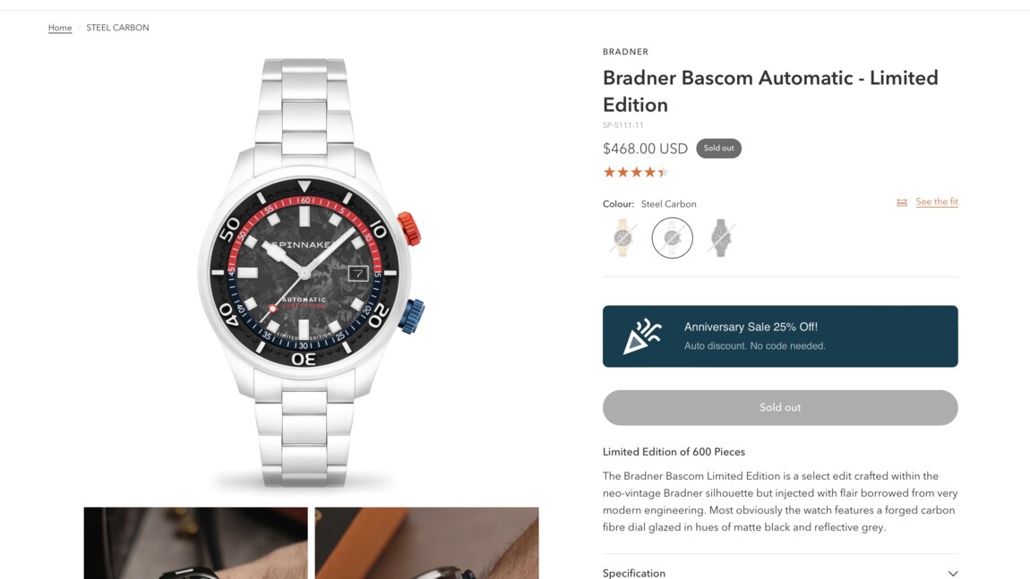 Продается Spinnaker Bradner Bascom Carbon Limited Edition Diver Automatic Mechanical Watch Часы Ceas RRP 420€