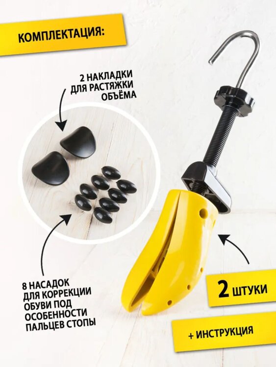Растяжка обуви нужна для того, чтобы Вы могли сделать свою обувь комфортной и удобной. Винтовой растяжитель представляет собой регулируемую раздвижную колодку (2 шт. в комплекте), с помощью которой можно не только увеличивать размер обуви в длину и в ширину, но и посредством специальных перемещаемых накладок растягивать определенные участки обуви с учетом индивидуальных особенностей вашей стопы. Растяжку для обуви часто используют в таких случаях, когда обувь натирает, жмет или ужалась например из-за долгого лежания в шкафу. Расширитель позволяет легко растягивать туфли, кроссовки, кеды, ботинки и даже сапоги на 1 см и более! Вы просто подкручиваете механизм и выставляете нужную длину и ширину, иногда перед растяжкой обувь нужно увлажнить водой или специальным спреем. Растяжитель подходят для обуви из кожи, замши, нубука, велюра и текстиля. Распорка для обуви не портит ее товарный внешний вид и изначальную форму, а только делает изделие максимально удобным и комфортным для ежедневной носки.