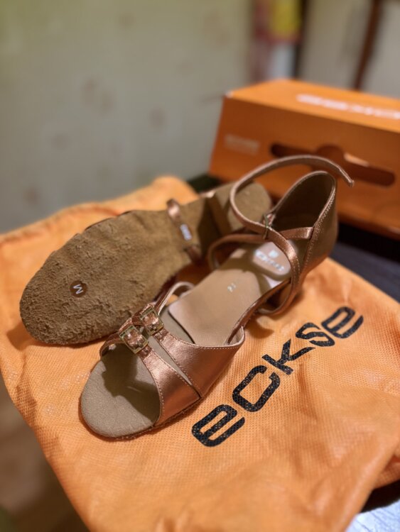 Бренд ECKSE. Атласные танцевальные туфли, каблук ≈5 см, металлические золотые пряжки. Размер 220 (M) или EU35 примерно. Не использовались — хранились в пыльнике и коробке, без дефектов, в комплекте ложка. Отличный вариант для занятий и выступлений.