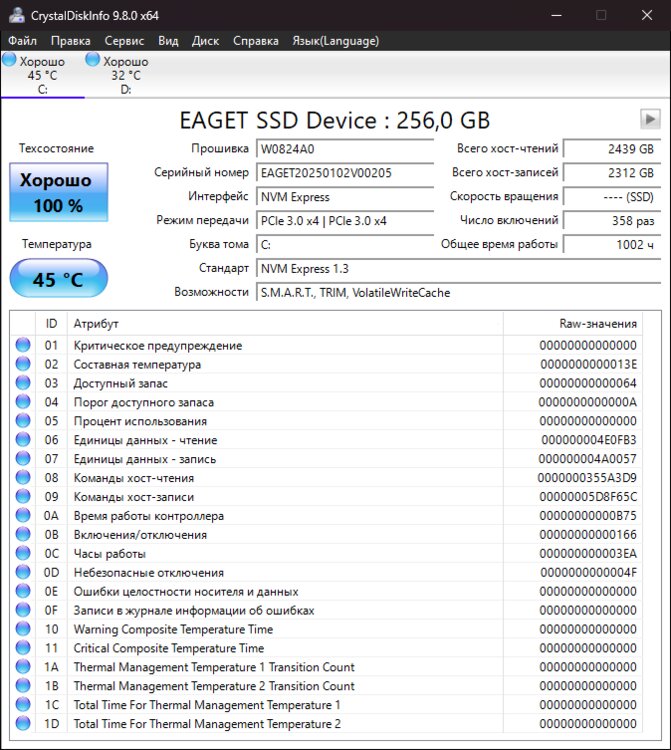 256GB NVMe M2 EAGET SP3000 PCI-e 3.0.