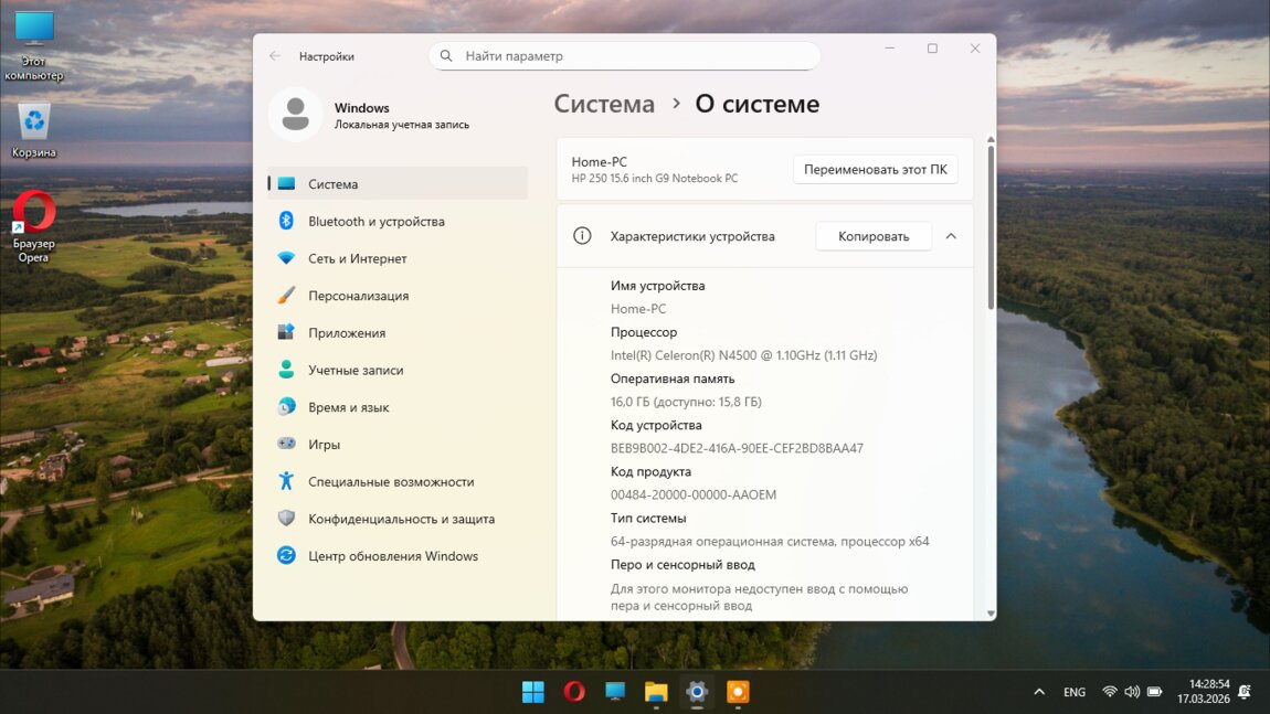 • Процессор: Intel® Celeron® N4500 (Turbo 2.80 GHz) — холодный и бесшумный.