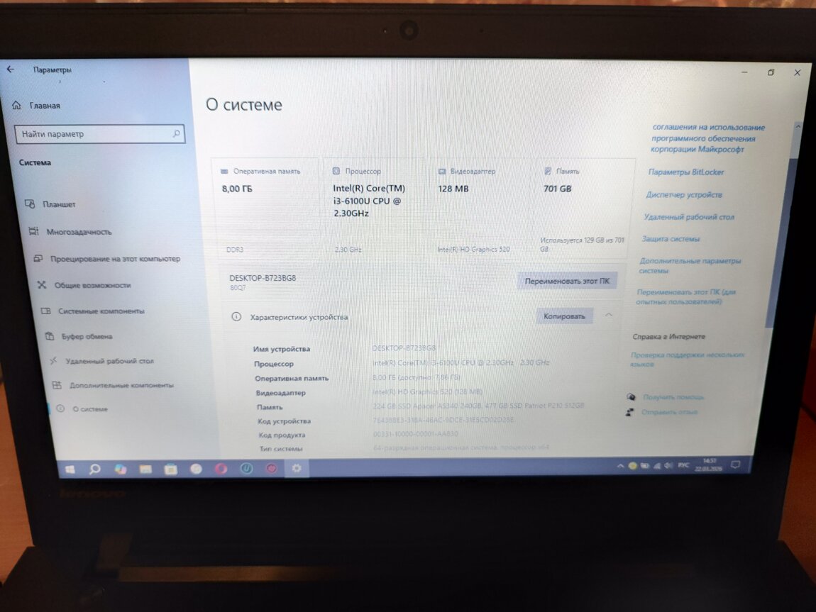 Процессор: intel(R) Core(TM) i3-6100U CPU 2.30GHz