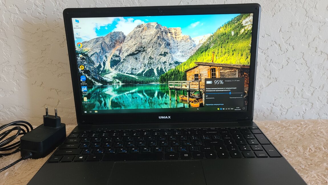 Ноутбук работает тихо (пасивное охлаждение). От батареи может работать более 5 часов. В комплекте оригинальное зарядное устройство.
