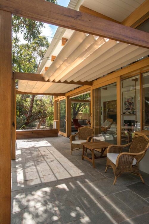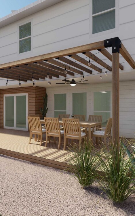Пергола-патио обеспечивает тень, но часто проектируется как открытая, что позволяет воздуху и свету свободно циркулировать. Это позволяет ей оставаться комфортной в жаркую погоду.