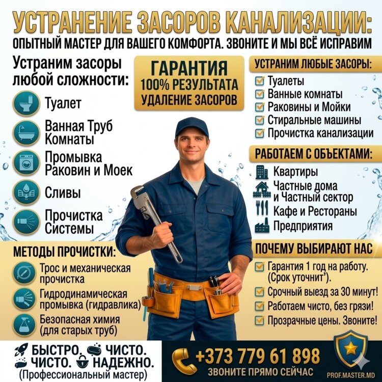 Устраняю засоры любой сложности быстро и с гарантией результата.
