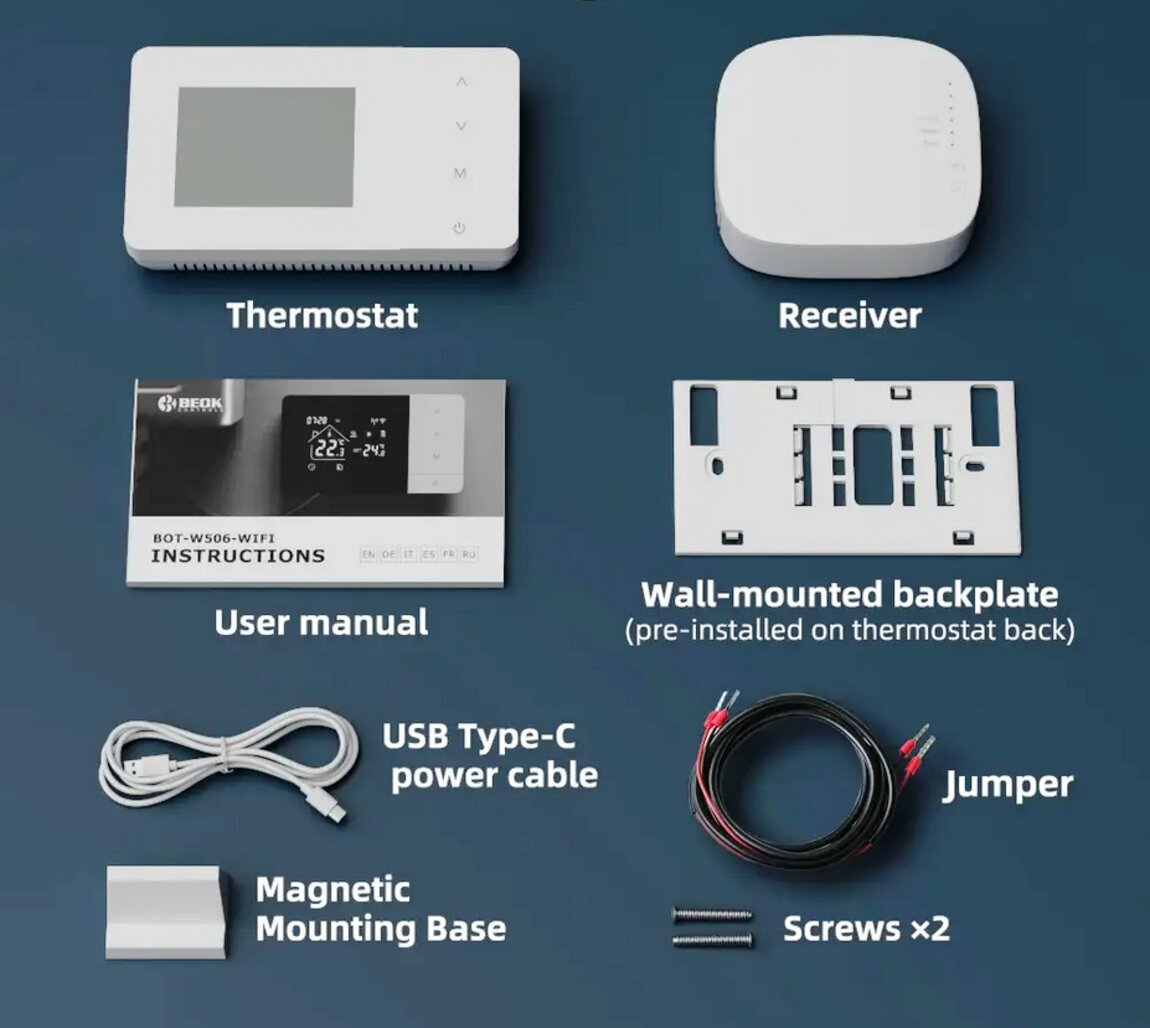 Пользователи могут задавать целевую температуру, программировать графики, выбирать режимы работы и т. д. Обычно ресивер подключается к отопительному оборудованию (например, котлу и т. д. ). Он получает беспроводной сигнал, отправленный корпусом термостата, и управляет включением или выключением устройства в соответствии с командой.