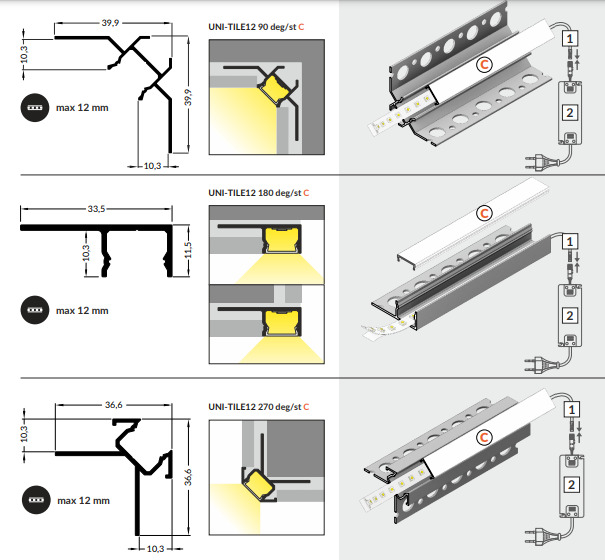 UNI-TILE12 - светодиодный профиль специального назначения, и предназначен для светового декорирования углов, как внутренних, так и наружных, облицовываемых керамической плиткой. UNI-TILE12 предполагает использование светодиодной ленты или модулей шириной до 12 мм. А высококачественный светорассеивающий экран защёлкивающегося типа позволяет легко произвести замену световых элементов в случае необходимости.