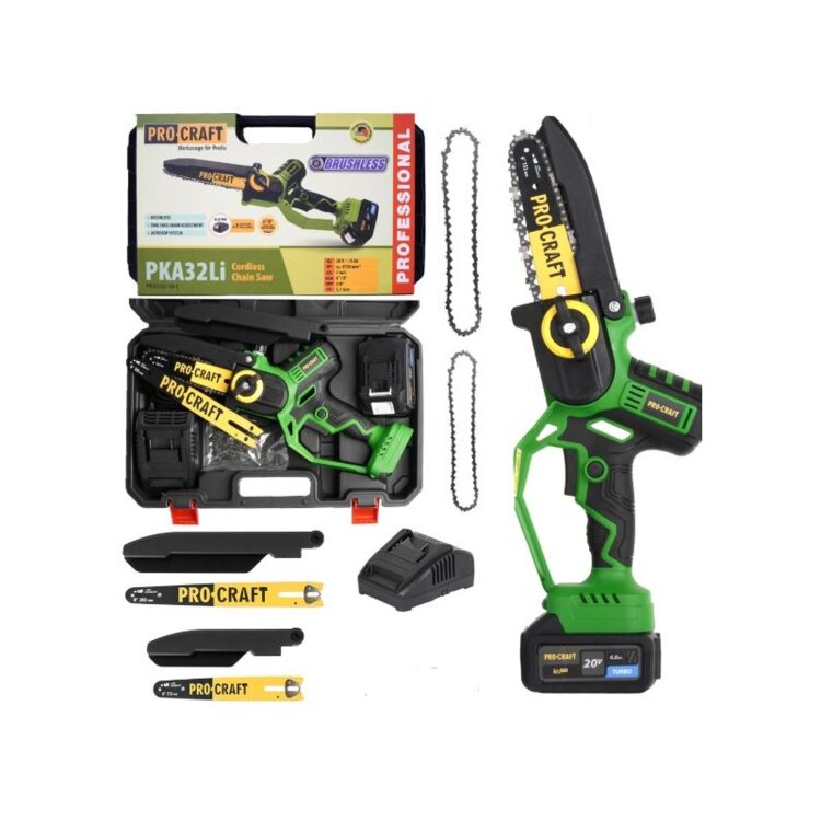 Мини пила Procraft PKA32Li – это компактный и мощный инструмент, идеально подходящий для резки древесины и мелких строительных задач. Бесщеточный двигатель обеспечивает высокую надежность и долговечность. Пила оснащена шинами длиной 6 и 8 дюймов, что делает ее универсальной для разных задач. Скорость цепи достигает 7 м/с, а число оборотов на холостом ходу – 4700 об/мин, что гарантирует точность и эффективность работы. Приятным дополнением является автоматическая система смазки цепи и безключевая натяжка цепи, что облегчает обслуживание. Уровень звукового давления составляет всего 80 дБ, обеспечивая комфортную эксплуатацию. В комплекте идут два аккумулятора на 20 В, зарядное устройство, две цепи, защитные планки и кейс для удобного хранения и транспортировки.