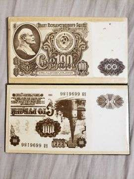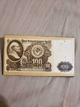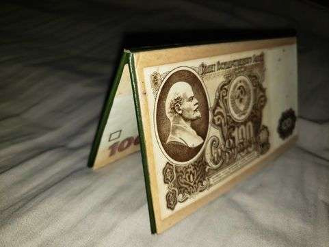 Кошелёк выполнен из двух частей, титульные стороны которых украшены купюрами 100 рублей образца 1961 года времён СССР.