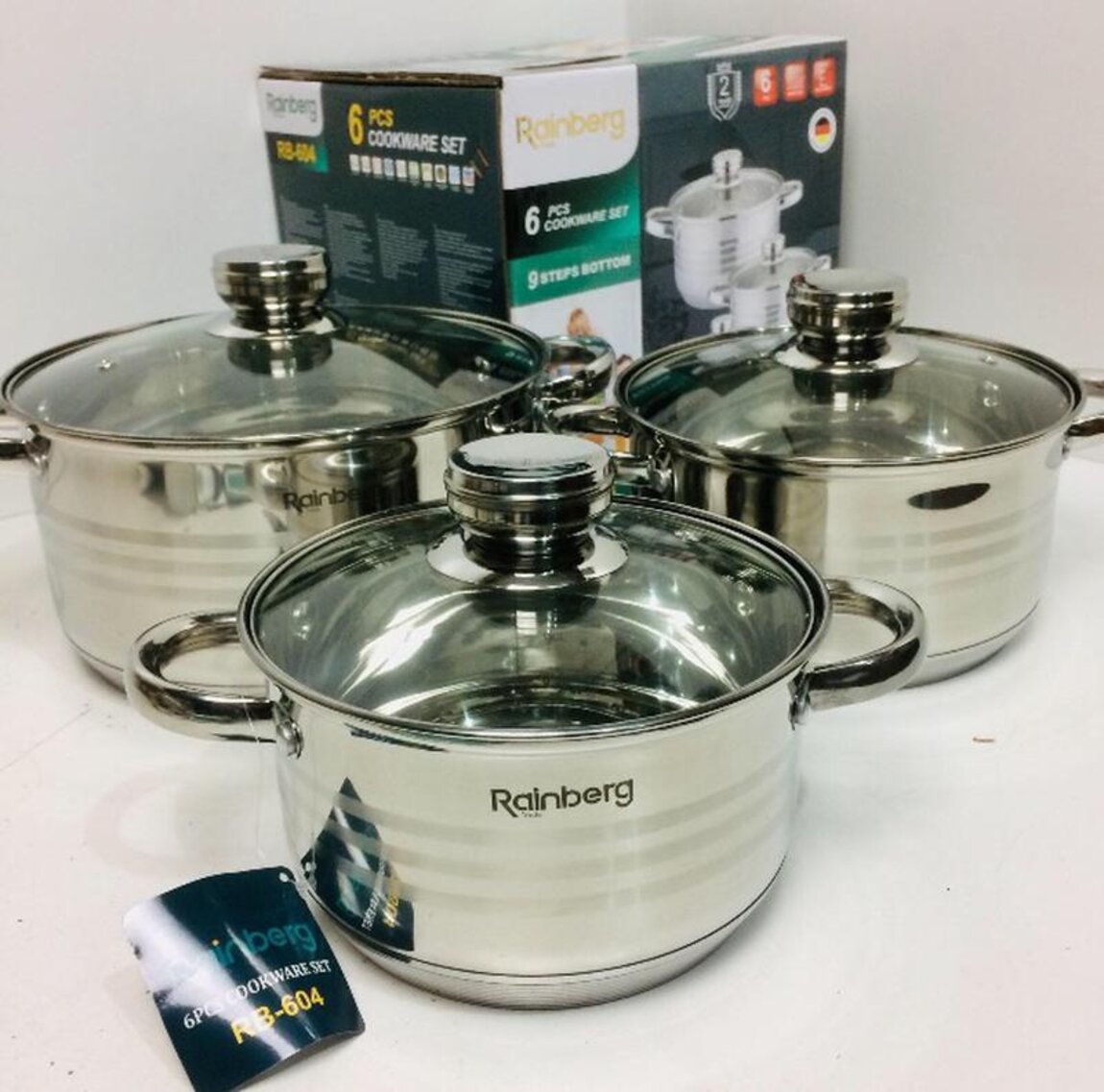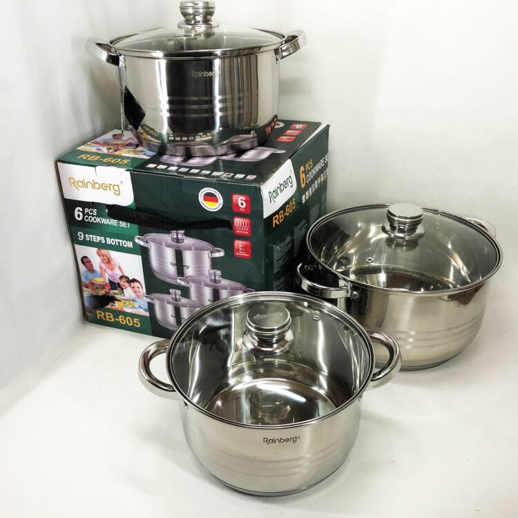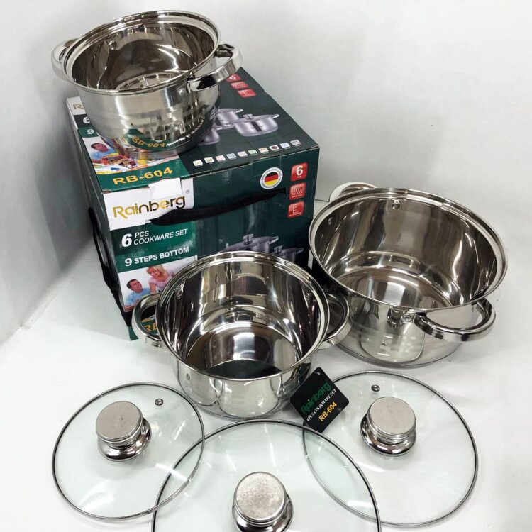 Новые наборы 9ти слойной тяжелой посуды фирмы фирмы RAINBERG 6 предметов толстая высококачественная нержавейка пища остаётся горячей очень долго, не нагревающиеся ручки, подходит для всех видов плит, в комплекте 3 кастрюли 3крышки объем 6л 300мл 3л 100мл 1л 800мл 6предметов. цена 600руб